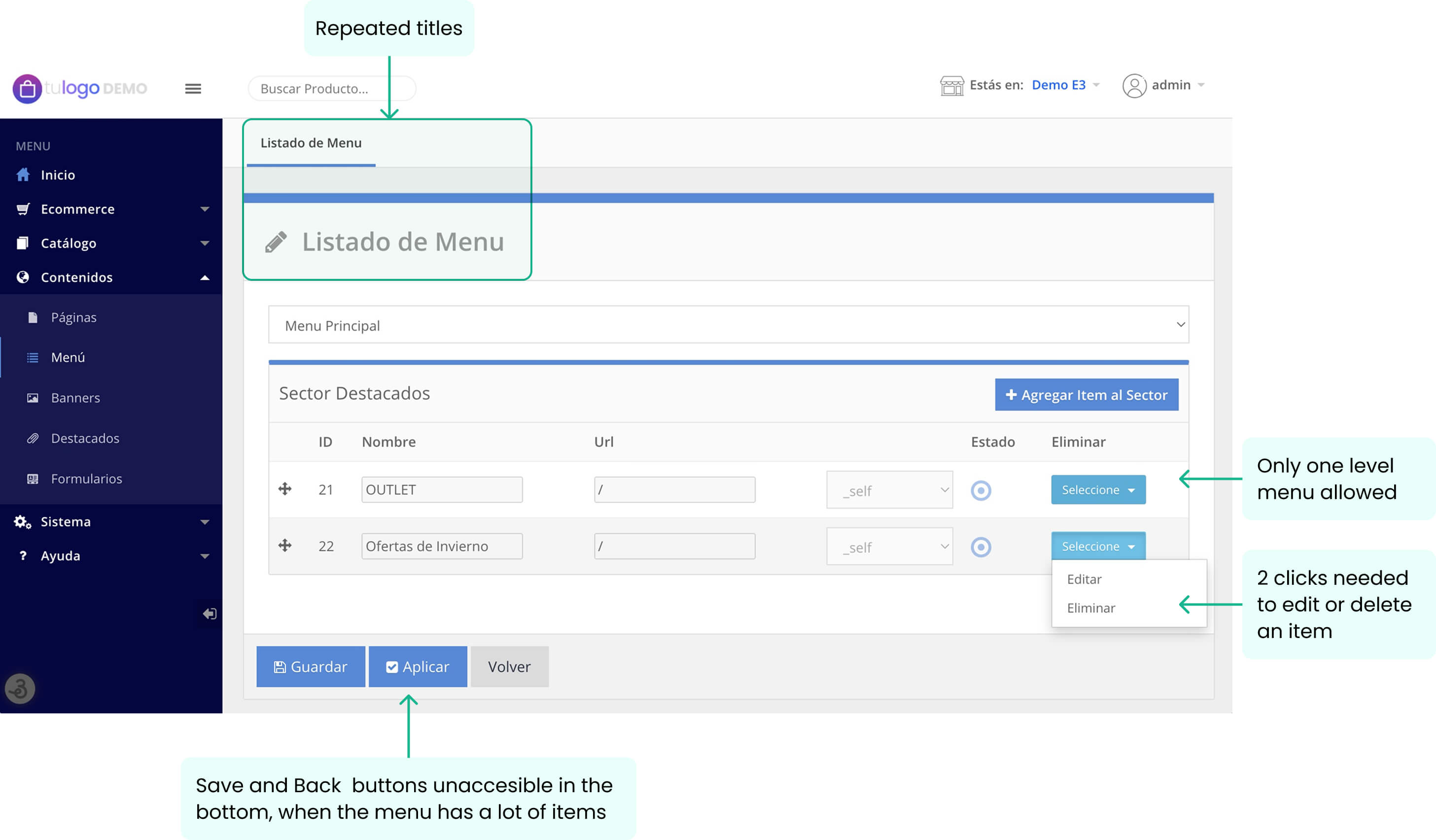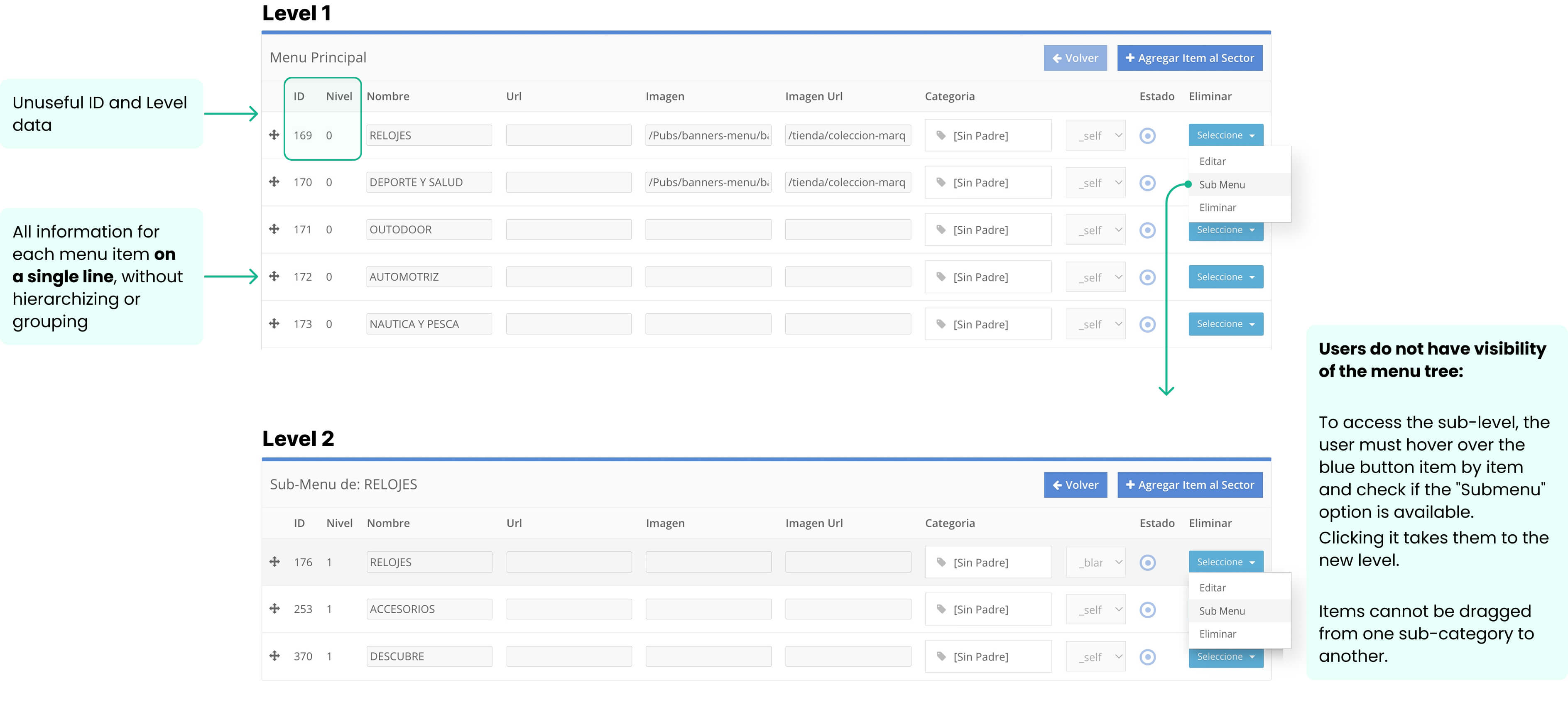 - Single-level menus had to be pre-configured by e3stores’ technical team.