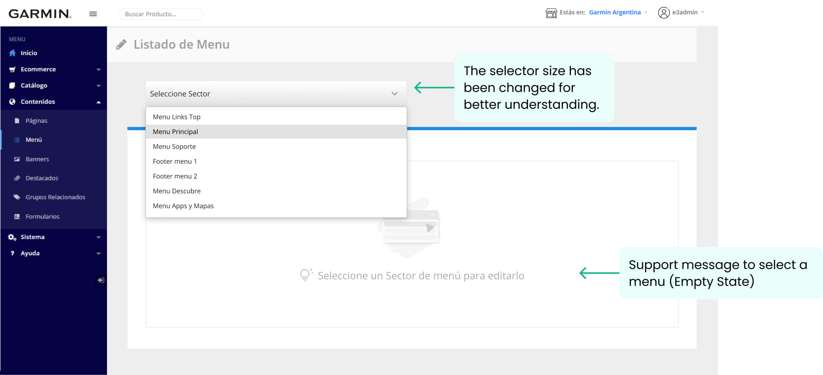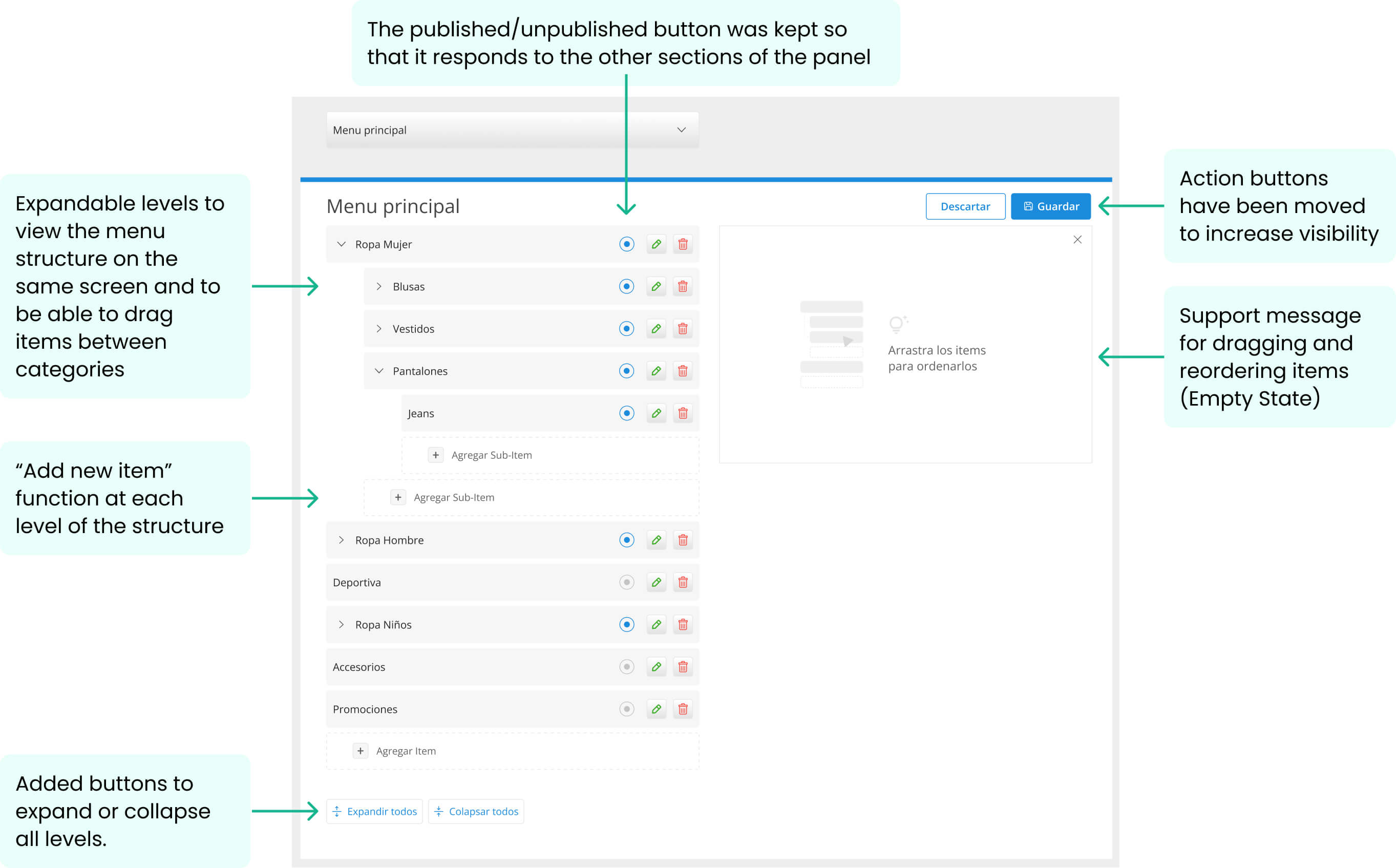 Redesigning the experience of creating and editing menus in an e-commerce admin panel.