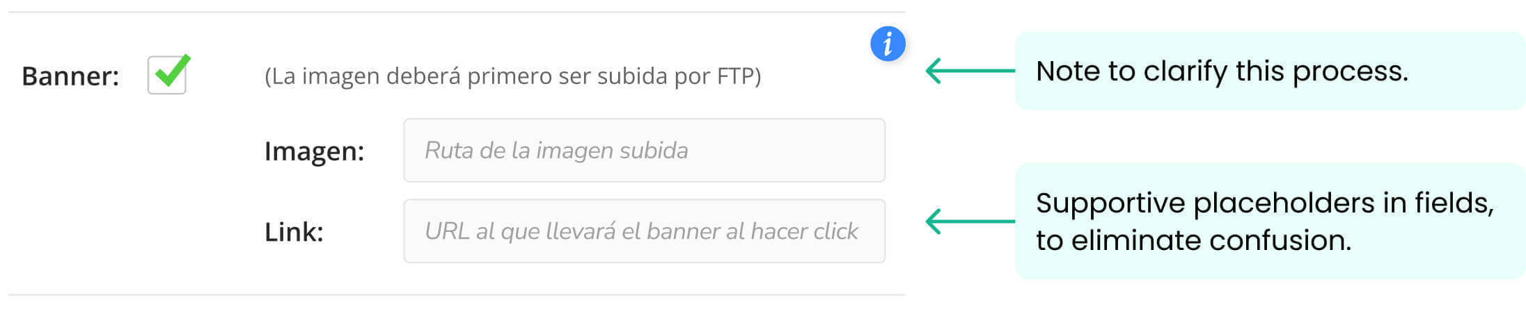 During user testing, we found that users struggled to differentiate between the image path link and the CTA link for the banner. To address this, we added supportive placeholders to eliminate confusion.